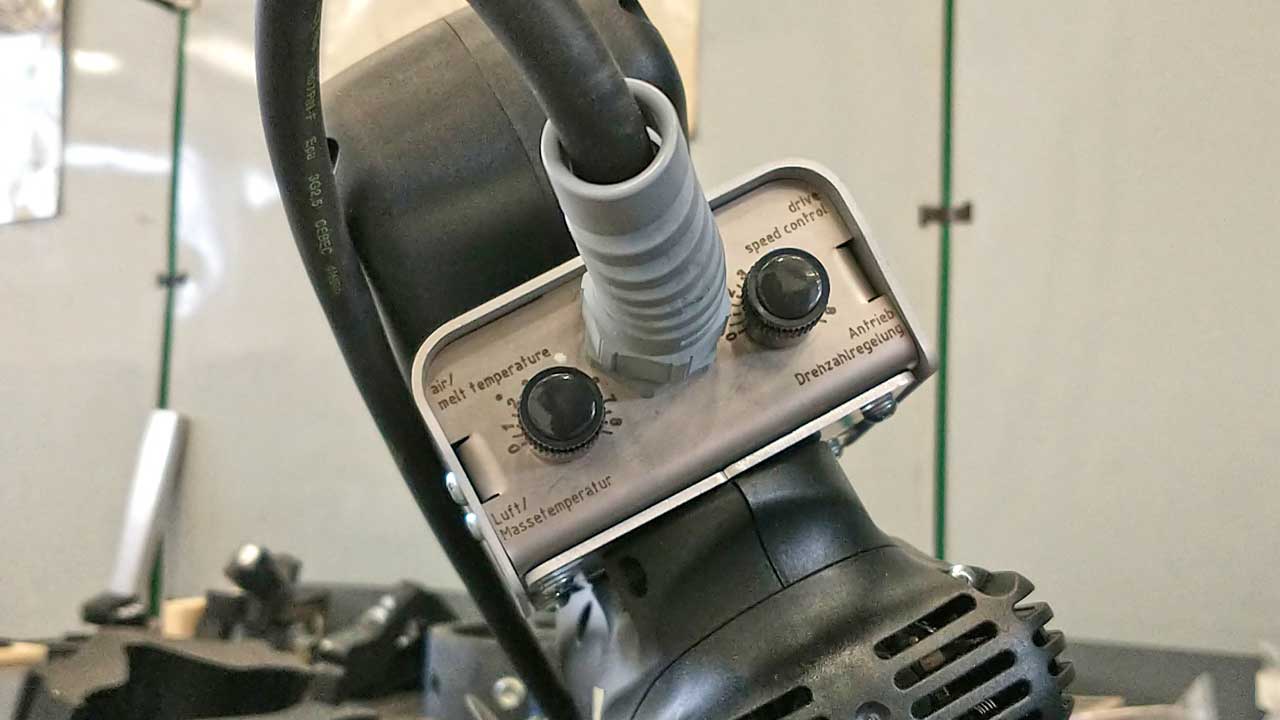 Il trapano motore oltre aziona l’alimentazione del filo che avviene in modo automatica e permette l’estrusione dello stesso nella camera di estrusione sotto forma di cordone plastificato. Il materiale sciolto prenderà forma nel pattino in PTFE sagomato a seconda delle esigenze.