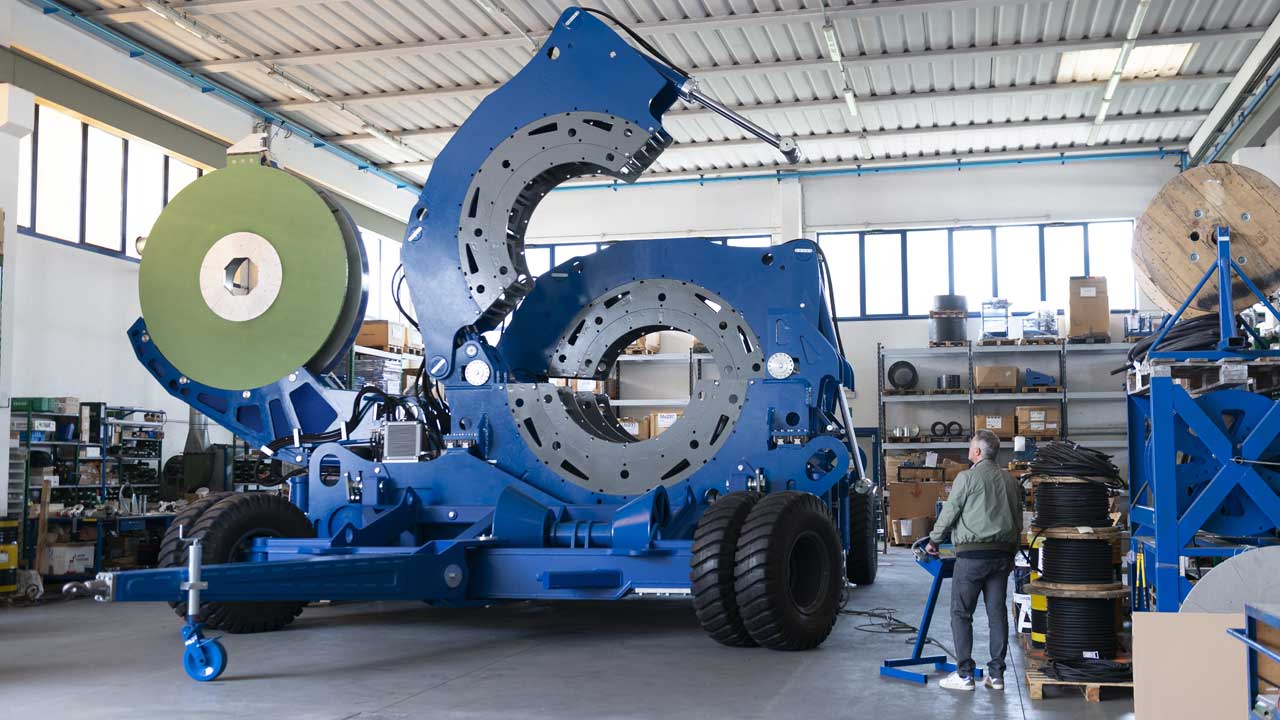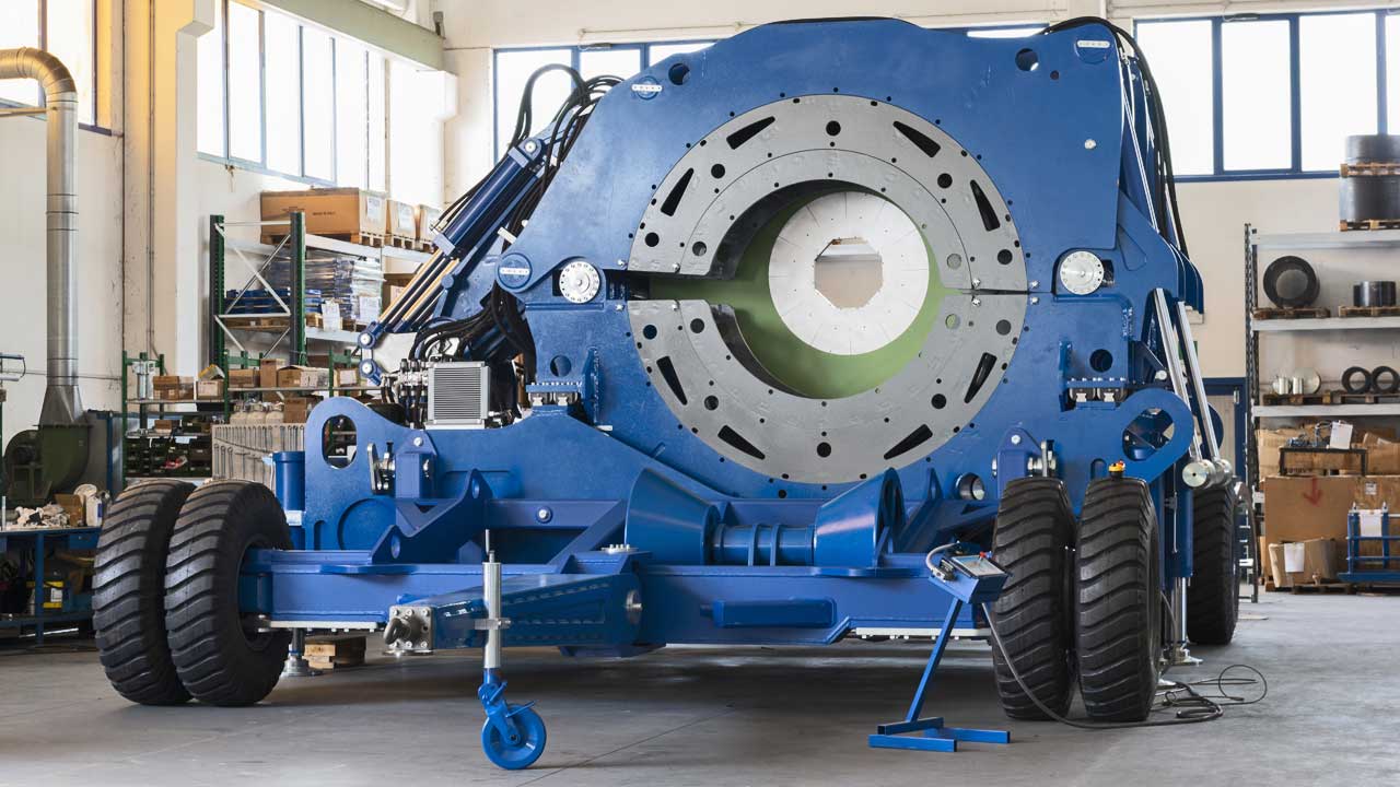 Saldatrice testa a testa da cantiere per tubazioni fino a d. 2700 mm, montata su carrello trainabile e sterzante.
